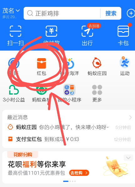 支付宝首页点“红包”,顶部摇一摇,有5个小红包