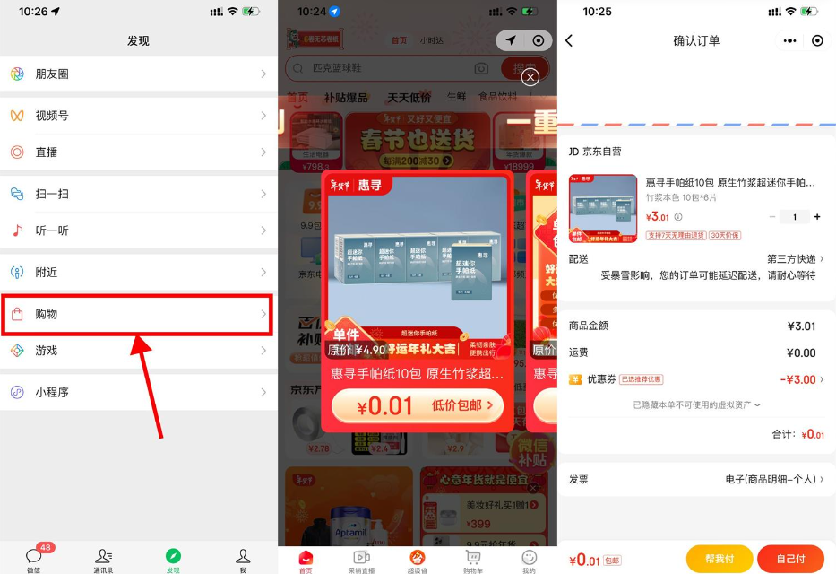 进入“微信-发现-购物”->大部分人自动弹出0.01亓实物,任选一个都是包邮的(如果不弹尝试右上角重新进入小程序)