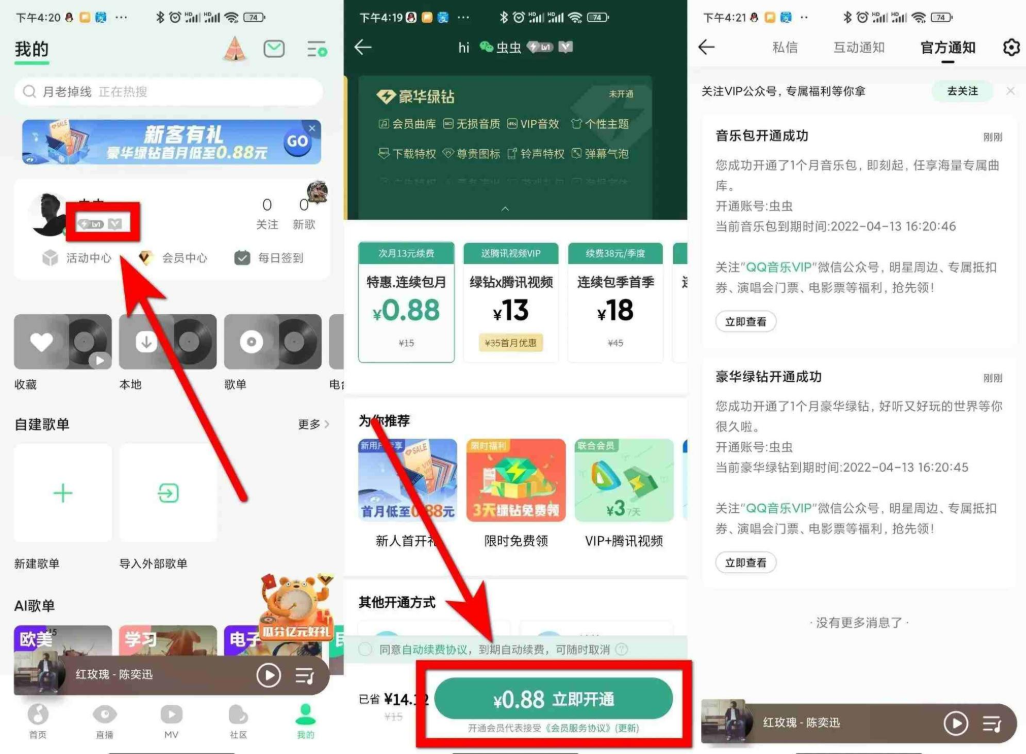 看金额显示0.88元开通即可参加->扣扣微信都可开通开通后去取消自动续费