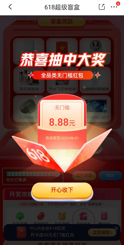 【活动介绍】京东app超级盲盒必中8.88-16.88无门槛红包