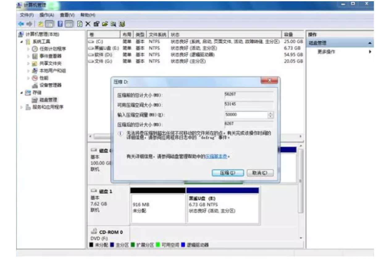 3.输入压缩的空间量,具体大小由接下来要安装的系统决定,这里选择安装win10系统,win10的系统盘最好不要小于40G(40960MB),所以决定压缩空间量为50000MB。