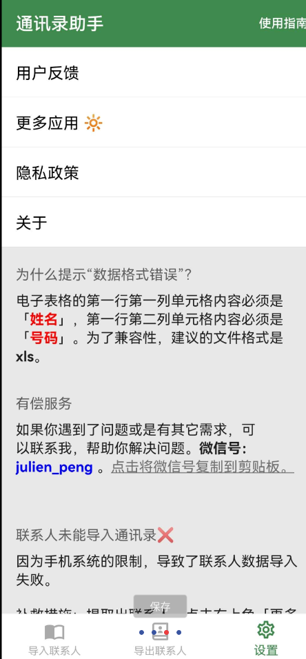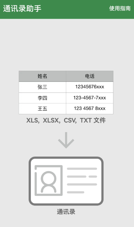 【软件特色】这款通讯录助手可以快速的将excel联系人导入到手机通讯录中。也可将手机联系人导出到excel通讯录,还可将excel联系人发送到qq或微信进行导入,真正的做到通讯录资源共享,支持根据导入的前缀一键删除导入的号码。拥有此qq/微信通讯录同步助手再也不用怕号码丢失。