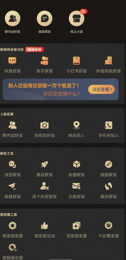 【应用简介】这是一款拥有众多功能的微商工具,为用户提供了海量高效实用的功能,包括人脉扩展、常用工具、点赞发圈、精选功能等多个分类,用户可以非常轻松的添加好友,以及群发消息。此外,该软件还推出了货源代理的服务,提供服装、美妆、鞋靴、箱包、表业等多个分类商品,用户可以选择品类和品牌来代理产品,无需担心没有货源的问题。