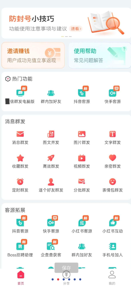 微粉大师,微商一站式人脉拓展大师。这里有消息群发、客源拓展、微x好友管理、朋友圈转发等众多工具,我们专业为微商以及其他有需要的用户解决各种获客找客户的痛点难点,能够有效提高拓客效率,精准获客,快速成单。【群发大师】图文群发、视频群发、智能群发……自定义关键词,丰富群发模板,AI智能微x群发,分批发送,无论您想怎么群发,我们都尽力帮您实现。【客源大师】微x扫码加人,批量好友添加,抖音、快手、小红书、企查查多渠道智能标签筛选,评论获客引流,精准客源即刻掌握。更有BOSS直聘小助理,轻松打招呼招人。【信息大师】未读消息一键处理,微x信息快捷回复,微x好友标签便捷管理,智能分析好友报告,轻松查找非好友,让微商更加了解客户资源。【群聊大师】拉一人进多群,拉多人进一群,批量退群,批量群公告,帮助微商用户减少繁琐操作步骤,加快成单效率。智能九宫格切图,批量抓图,更多精彩,就在微粉大师,微商工具箱管家app,帮助微商解放双手。