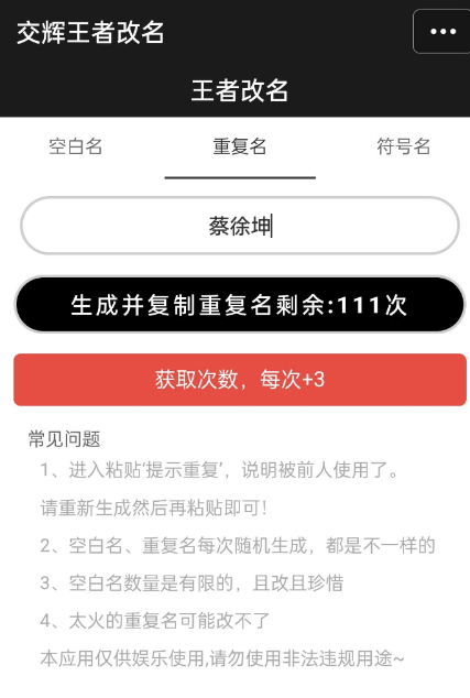 【特别说明】免广告获得奖励,点击获取次数每次都能+3,注意别点太多哦够用就行,因为每一次进去都会重置[滑稽],楼主已经抢占了两个热门名字了“蔡徐坤” ,“赵丽颖”,你们赶紧行动吧[开心]